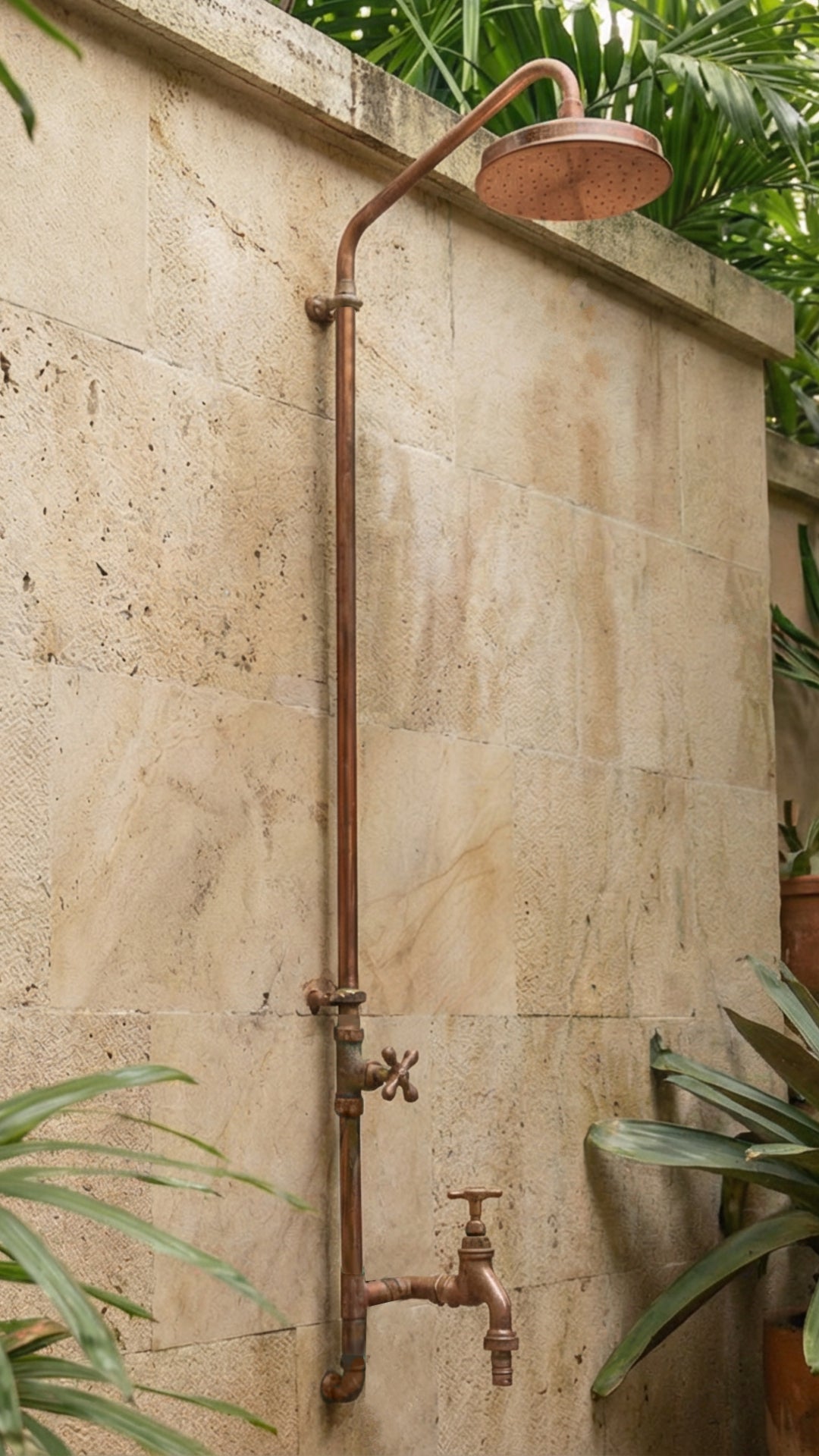 Create your own spa retreat with the Jardin copper cold shower – a luxurious wall-mounted fixture designed for garden sanctuaries, nature-inspired patios, or stylish beach houses. Complete with a high-mounted shower-head and an integrated garden tap, Jardin combines outdoor utility with refined comfort.