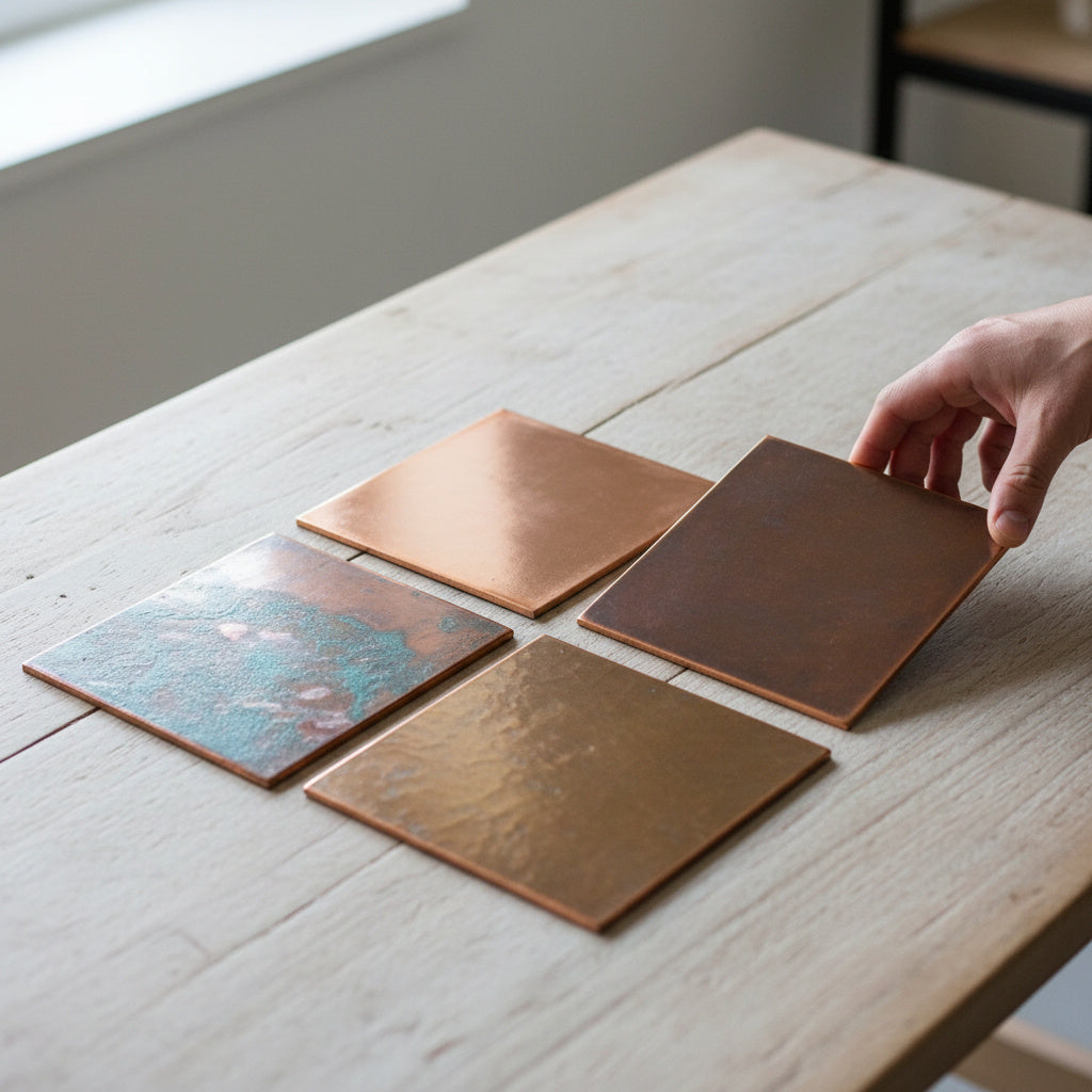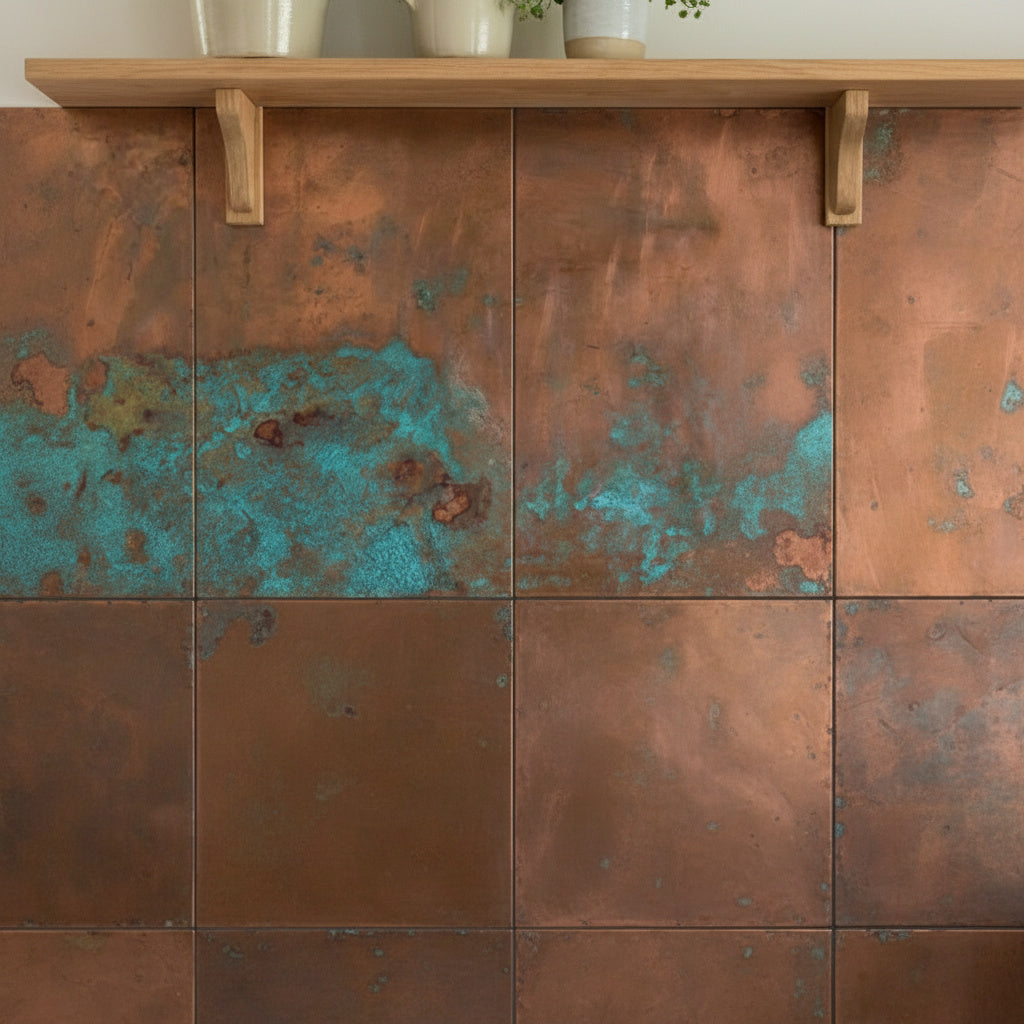Each tile is made from real copper — not copper-coloured ceramic or laminate — offering unmatched authenticity, texture, and luxury.